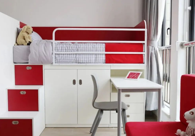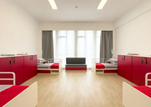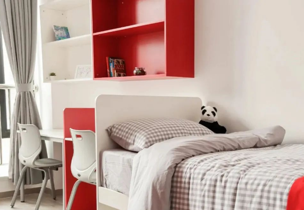预备部宿舍楼内的房间均为四人间,为2-6年级学生们提供舒适的住宿体验。相比于中学部的高架床,学校选择了贴地床铺和便捷的储物设施,确保日常操作的便利与安全。宽敞的布局鼓励孩子们进行游戏,营造了一个富有活力和吸引力的环境,适合休息放松和玩耍。四人间配备两个独立卫浴间,包含淋浴、厕所、洗手台及储物柜。