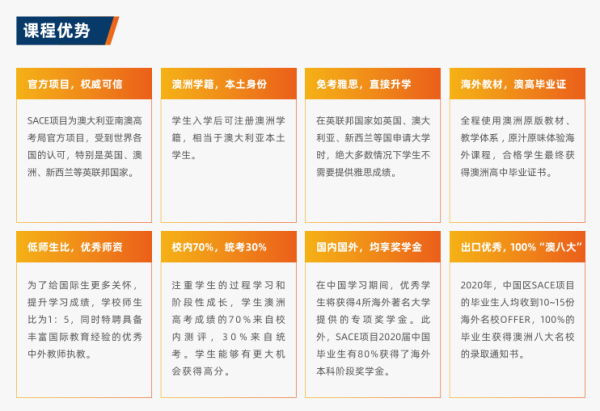 英澳SACE国际高中课程是澳大利亚南澳高考局与广州市为明学校合作的具有官方背景的国际项目。学生在中国完成澳洲高中课程(校内评测占总成绩70%),通过南澳高考局统考(统考成绩占总成绩的30%)后即可取得 SACE 证书。该证书是澳大利亚南澳高考局(SACE Board) 向完成 11、12 年级 ( 国内高二和高三 ) 学习并达到教学要求的毕业生颁发的南澳州高中毕业证书,凭借该证书中国学生可以进入全部英联邦及欧美等国家大学就读本科课程。其中,英国、澳洲、新西兰等英联邦国家可以免雅思直接进入大学。