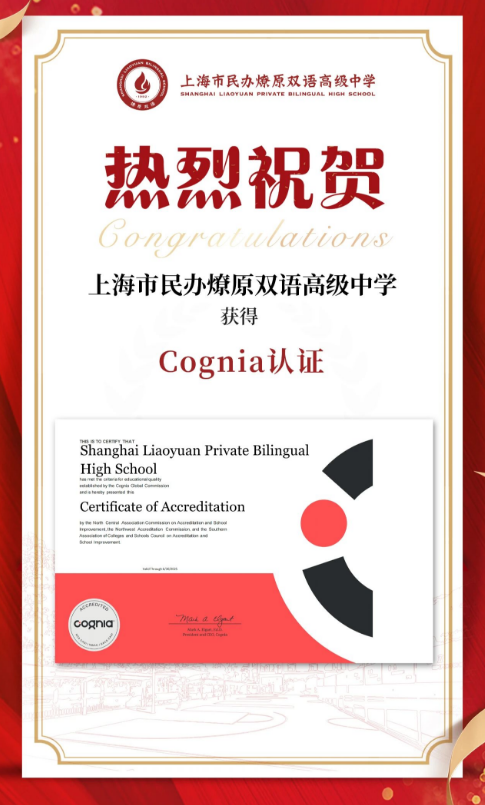 2024年6月29日,上海市民办燎原双语高级中学获得——全球最大非盈利性国际学校权威认证机构Cognia(原AdvancED)官方认证,正式成为Cognia认证学校。
