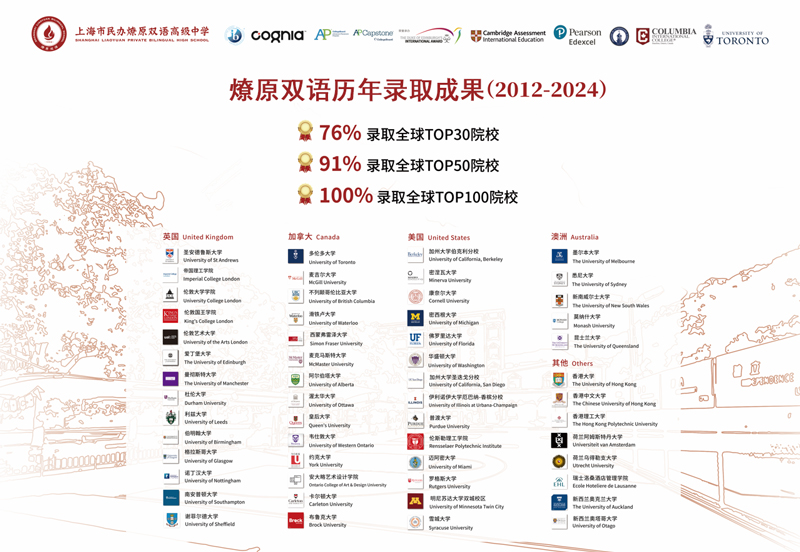 燎原高中国际课程班历届毕业生,76%录取世界前30大学,91%录取世界前50大学,100%录取世界前100大学。