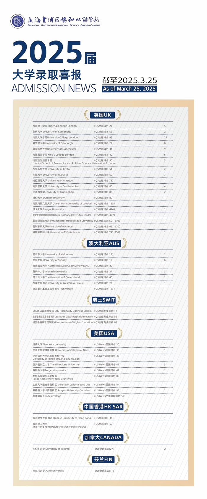 本届毕业生的录取结果呈现出鲜明的国际化特色。除了英美名校外,学生们还收获了来自澳大利亚、中国香港、加拿大、瑞士、芬兰等国家和地区的大学录取。这种全球化的录取分布,充分体现了学校培养具有国际视野人才的办学理念。