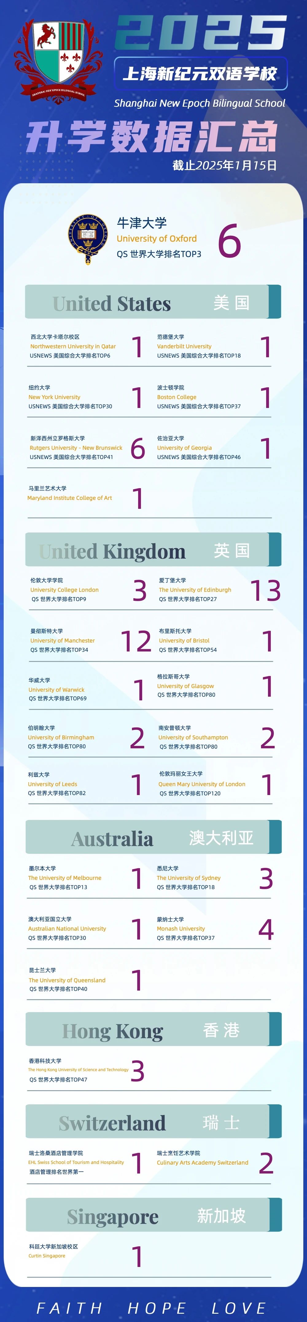As of January 14, 2025, the Class of 2025 from NEBS High School has received 72 offers from world-class institutions from 6 countries and regions. There are 12 from the United States, 43 from the United Kingdom, 10 from Australia, 3 from Switzerland, 1 from Singapore and 3 from Hong Kong.