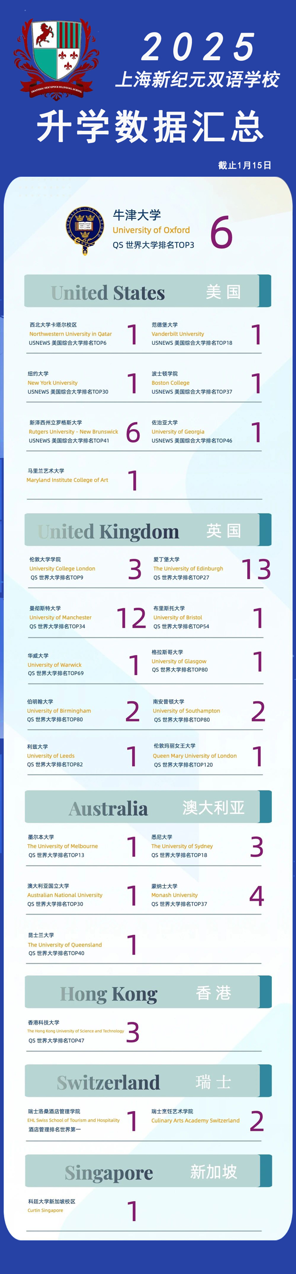 在2025年早申季中,上海新纪元双语学校双语高中部捷报频传,6位优秀学子成功获得牛津大学录取,专业涵盖物理、计算机、数学、数学与计算机、经济与管理以及古典学等多个热门领域。这一骄人成绩不仅彰显了学校的教学实力,更展现了学生们卓越的学术能力。