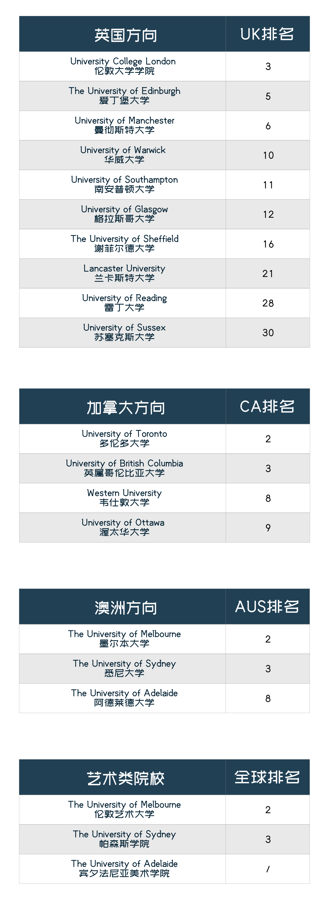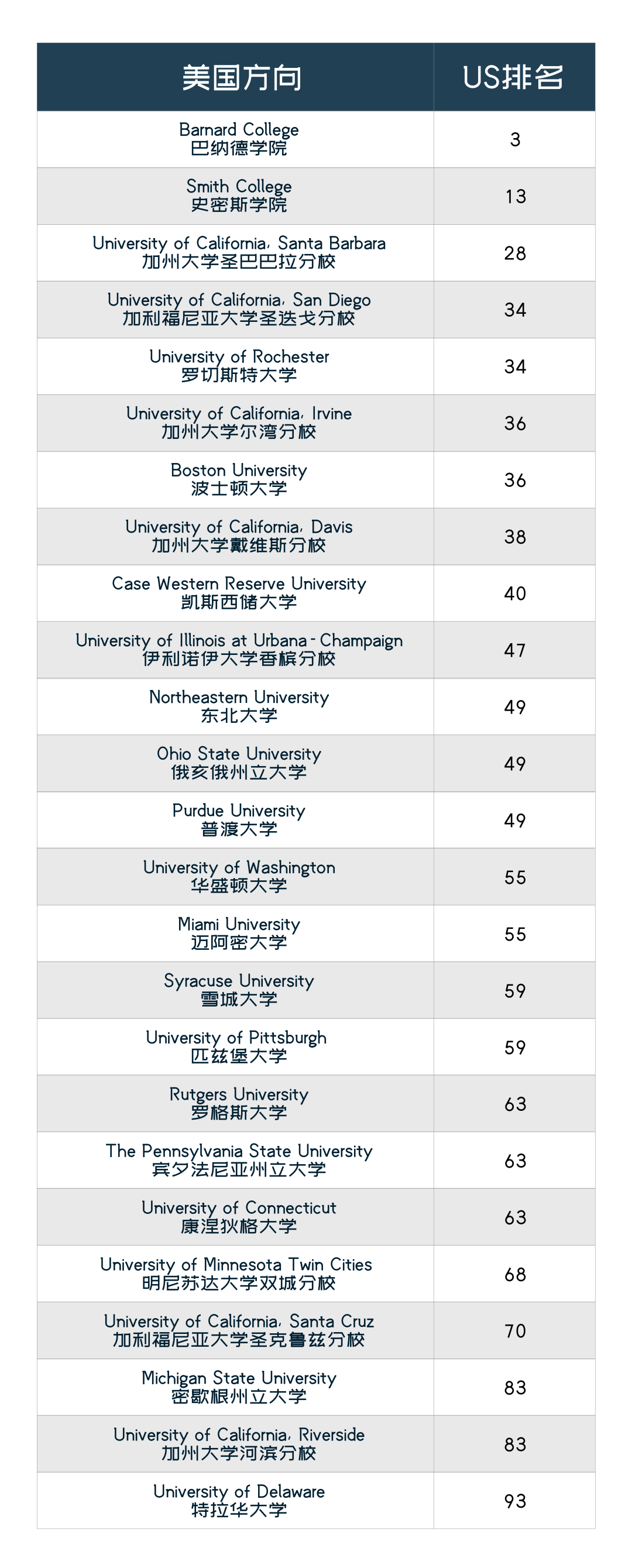 美国方向收获US News综合排名前30的大学的比例31%,US News前50大学的比例60%,QS/Times世界前30大学的录取比例21%。英国方向收获QS全英排名前5的大学比例为20%,全英前20的比例为90%。