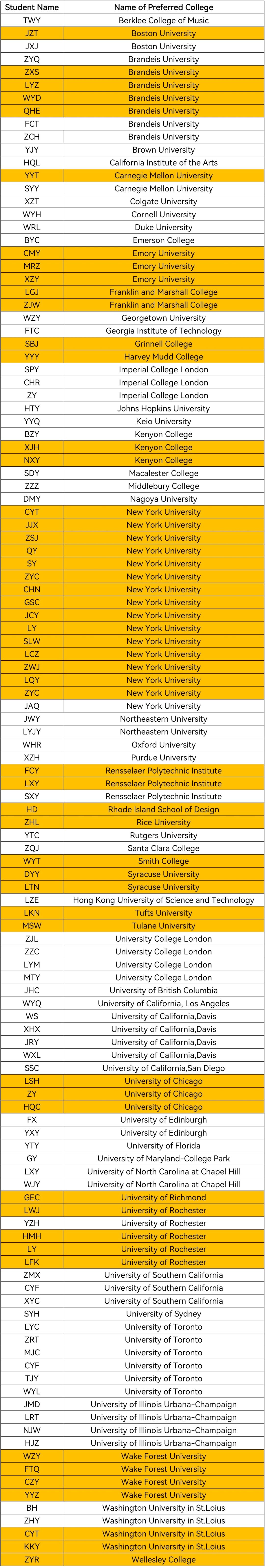 特别值得一提的是,星校自第一届毕业生开始每届都有芝加哥大学的录取,今年更是在ED1阶段就拿下三枚录取,冠绝全国。杜克大学也连续四年在RD阶段录取星校学生,纽约大学,南加大,北卡教堂山以及佛罗里达大学在学生没有AP成绩的情况下分别录取了我校两位数以上的学生,而在加州整体录取大幅缩水的背景下,加州大学洛杉矶分校和加州大学伯克利分校依然在我校录取了两位数的同学,充分体现了美国顶尖大学对我校学术水平以及学术诚信的认可。除去上面已经提及的学校以外,星校学子还收到了范德堡大学,埃默里大学,乔治城大学,卡耐基梅隆大学,塔夫茨大学,弗吉尼亚大学,威尔斯利学院,明德学院,戴维森学院等综合名校和文理学院的录取。