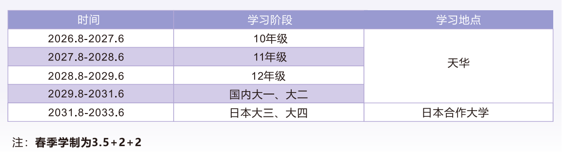 天华中日国际高中开设国内段2.5年➕日本段1年学习。课程设置包括:国内会考课程9门、日语、英语、EJU文综、EJU理综、通识类课程及素养类课程,以满足学生的考试要求及全面发展。