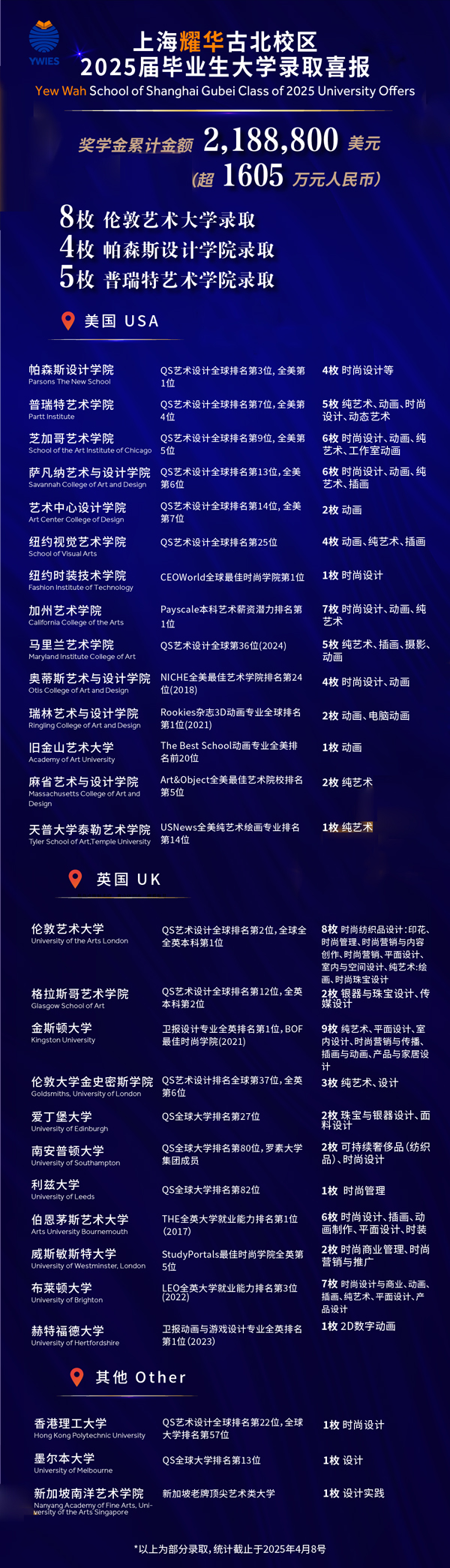 全球知名艺术设计类院校录取包括8枚伦敦艺术大学录取、4枚帕森斯设计学院录取、5枚普瑞特艺术学院录取,个人最高手握7枚录取。