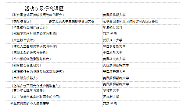 国际太空城市设计大赛、哈佛辩论赛、美国高中生十项全能竞赛(USAD)、AMC10/12数学竞赛、国际高中生机器人大赛、中国互联网+创业大赛、个人课题研究与指导、艺术作品集指导、影视作品集指导等