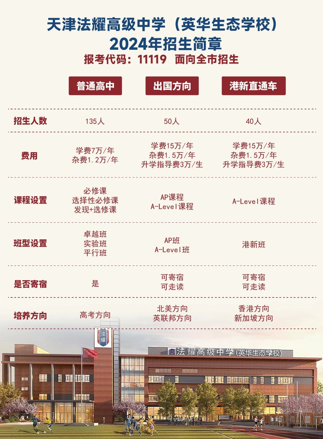 天津法耀高级中学(英华生态学校)位于天津市西青区,是首所与英华实验学校合作办学的全日制寄宿高中,开设有普通高中(招生代码:11119)、出国及港新三种教育方向,配备高水平的现代化教学设施,利用数字化技术精准开展人文、科学、艺体课程的教学,为学生提供一个与科技相伴的学习环境,体验个性共性相结合的学习支持;可视化安心食堂、独立卫浴宿舍,让学生在这里放松身心,充分休息,保持良好的学习状态。