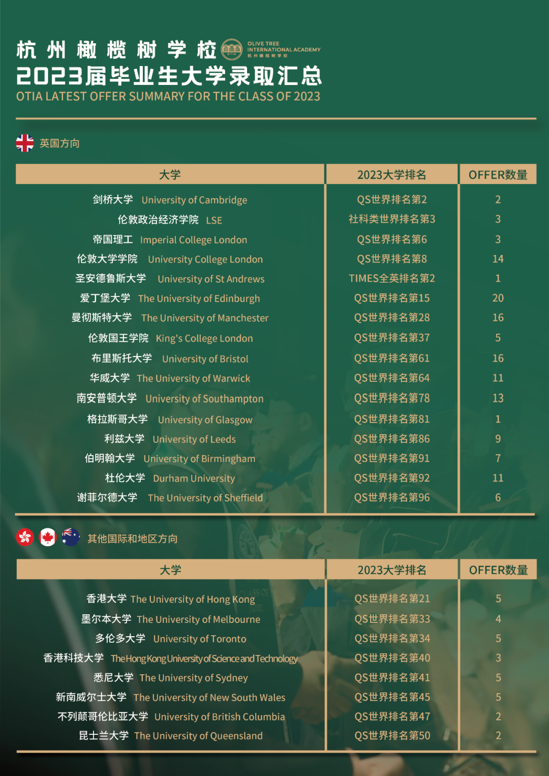 在2023届82位毕业生中,有44位同学申请了英国方向,其中17位同学收获了共计22封英国G5大学、2023QS世界排名前8大学录取通知书。19位同学申请了美国方向,其中16位同学被2023年U.S.NEWS美国排名前55名大学录取。艺术方向的18位同学更是在英美加艺术方向收获大满贯(另有1位同学只申请了加拿大和澳大利亚方向)!